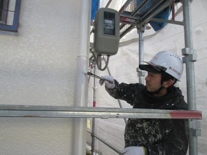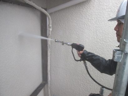 汚れが残ったまま塗装してしまうと、塗料の密着性が悪くなり耐久性も悪くなるおそれがあるので、汚れやチョーキングをきれいに洗い流していきます。