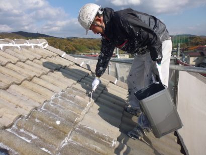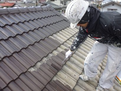 外壁と同様 塗料の密着性を高めるため 屋根も下塗り剤をたっぷりと塗っていきます!