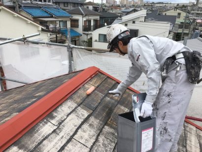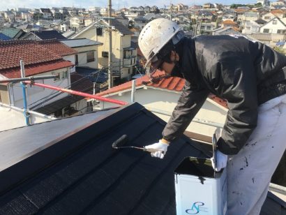 屋根も外壁と同様 たっぷりと下塗り剤を塗っていきます。