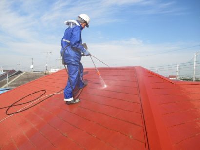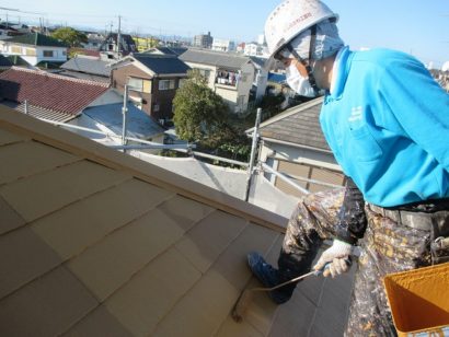 外壁と同様 塗料の密着性を高めるため 屋根も下塗り剤をたっぷりと塗っていきます!