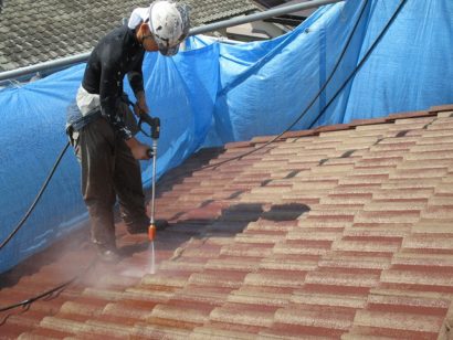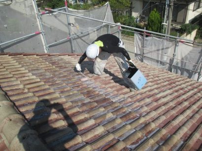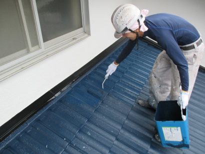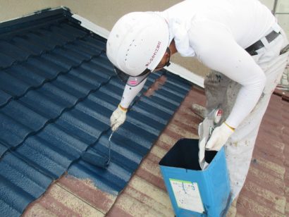 外壁と同様 塗料の密着性を高めるため 屋根も下塗り剤をたっぷりと塗っていきます!