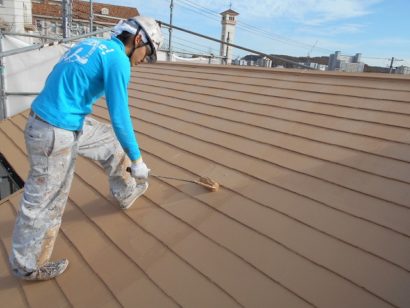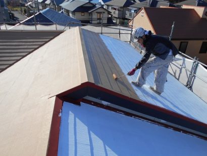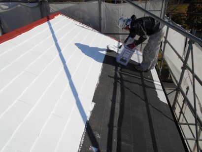 屋根も外壁と同様 たっぷりと下塗り剤を塗っていきます。 下塗りを終えた屋根は 真っ白! まるで雪山のようです(笑)