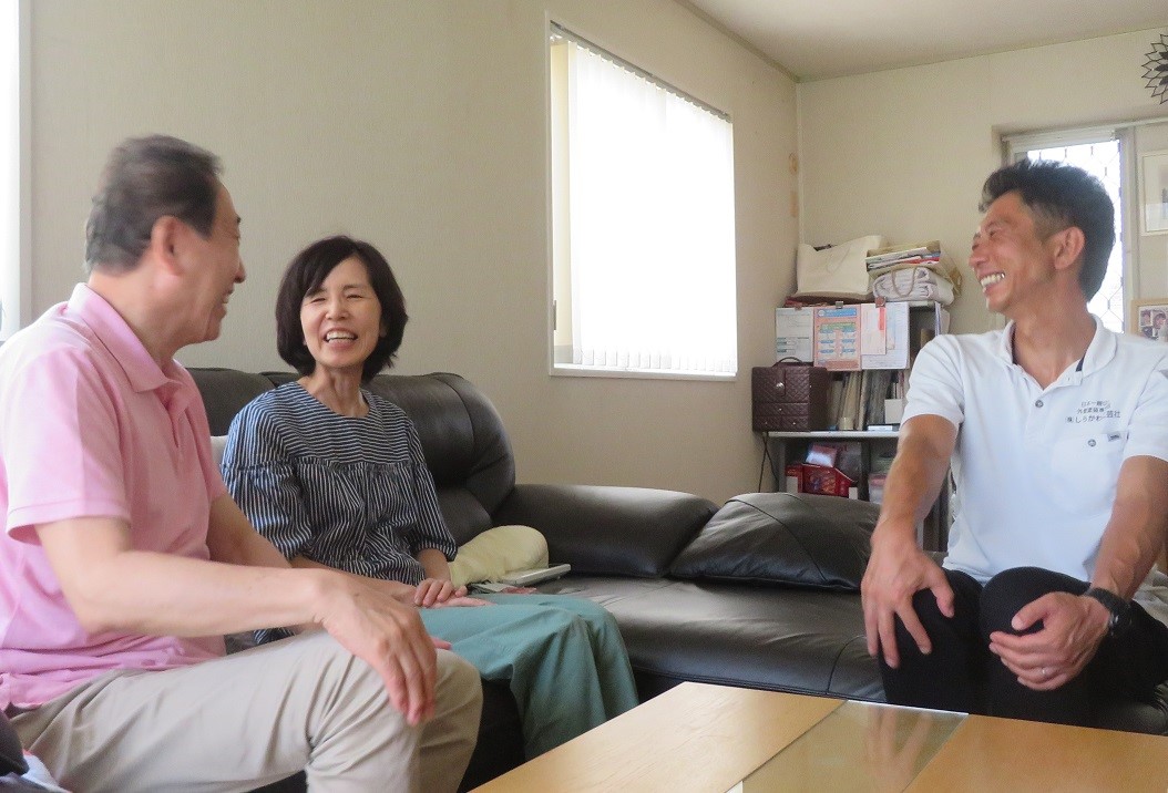ご主人:濱上さんがうちに来てくれて、初めの印象通りだったし、きっちりやる会社である、そういうところなんだと感じました。仮に、濱上さんが契約してすぐに辞めてしまったとしても、僕が濱上さんを信用して物事決めたんなら後悔もないんです。見積り出してもらっても、僕らは相場なんてわからないです。何がいくらなのか、これがいいとか悪いとか言われてもわからん。話をして、濱上さん自身から会社の信頼性というのがわかって、それで自分らが決めたのならそれでいいやんという話を家内として。そのあとに、家内が「あなた、実はね・・・」みたいな話をして「そうなん?!だったら、それでもうええじゃないか!」と話して。「良かったやん」って(笑)